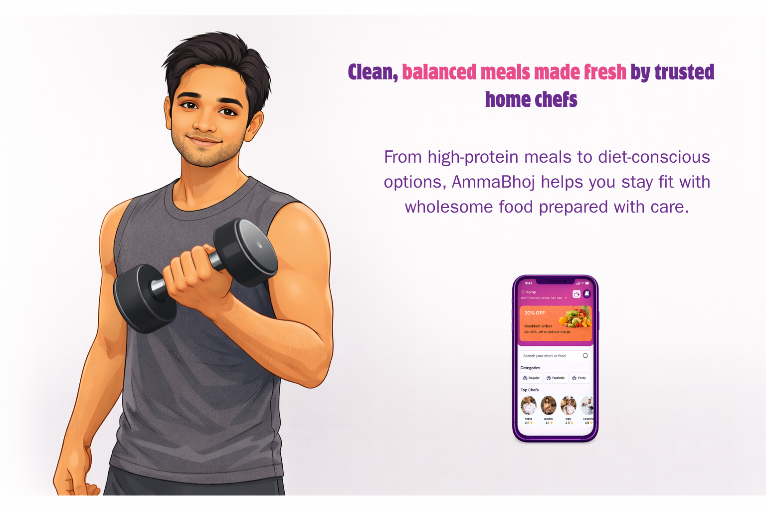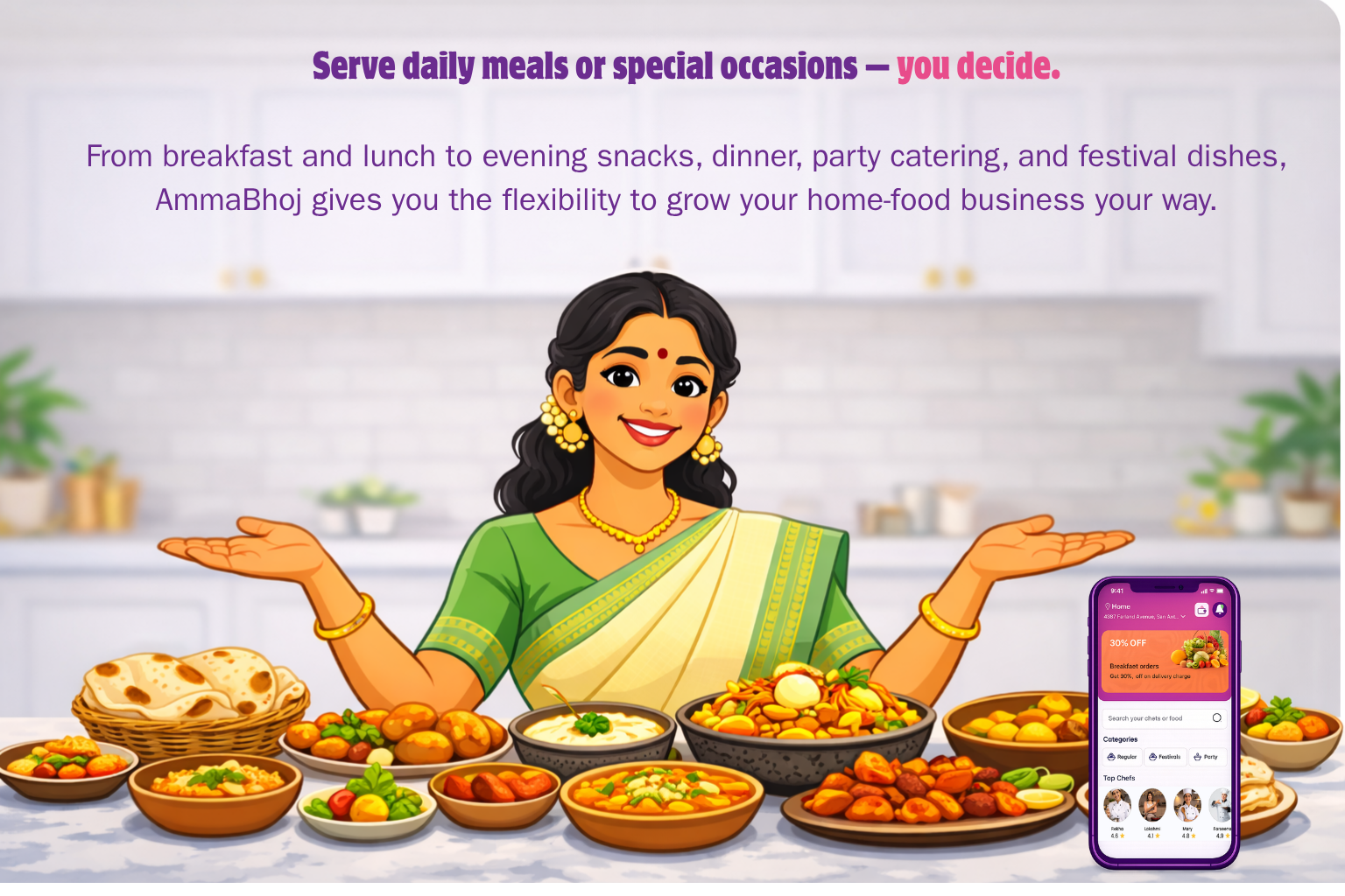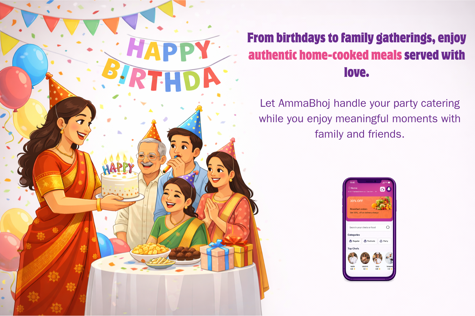 Discover delicious homemade meals prepared by passionate home chefs in your neighbourhood. AmmaBhoj connects food lovers with authentic home-cooked dishes made with care and tradition.